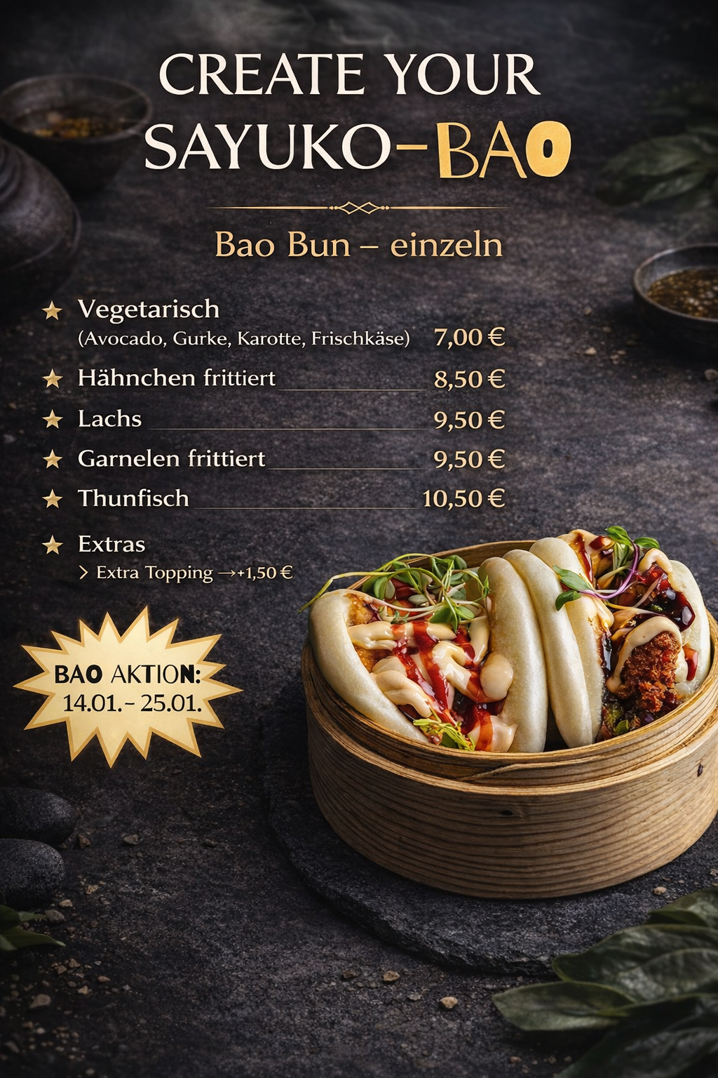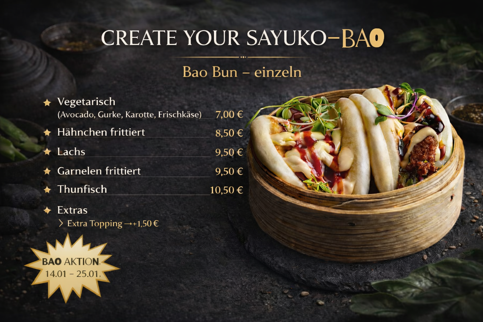 Unsere Köche vereinen traditionelle japanische Rezeptkunst mit kreativen Eigenkreationen – so entstehen Gerichte, die Sie nur bei Sayuko Sushi finden.